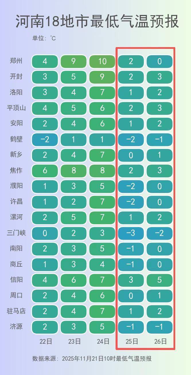 25日早晨也将是本轮天气过程的最低温时刻,西部、北部地区的最低气温将降至-6℃到-2℃,省内其他地区也普遍在冰点附近徘徊。