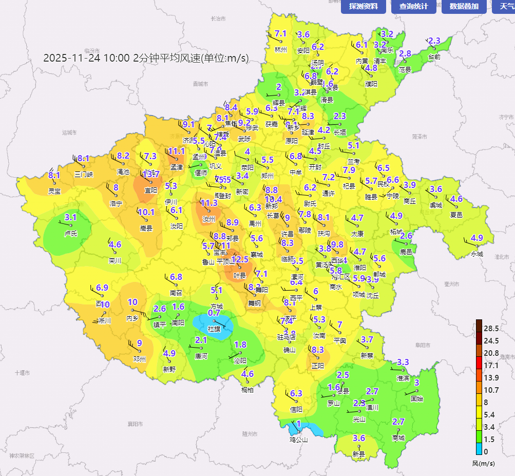 开封市气象台2025年11月24日11时35分将大风蓝色预警信号升级为大风黄色预警信号:预计未来12小时,龙亭区,城乡一体化示范区(城西街道,梁苑街道,金明池街道,西湖街道,杏花营街道,金耀街道,水稻乡),顺河回族区,鼓楼区,禹王台区,祥符区等乡镇和街道将出现8级左右西北风,阵风9到10级。请注意防范。