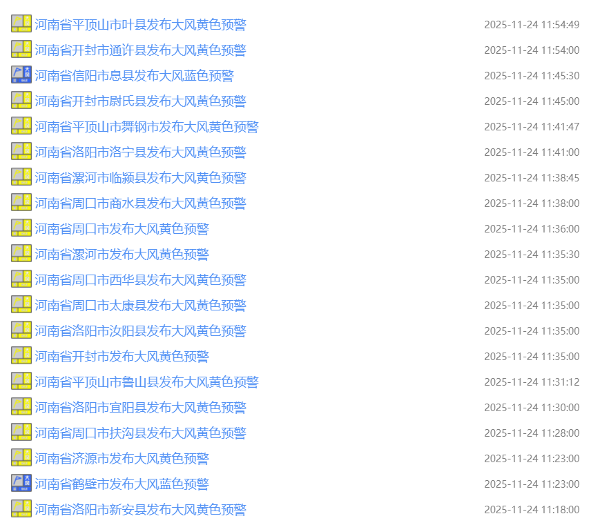 截至11月24日12时30分,河南共109个生效中,其中,多地发布大风黄色预警