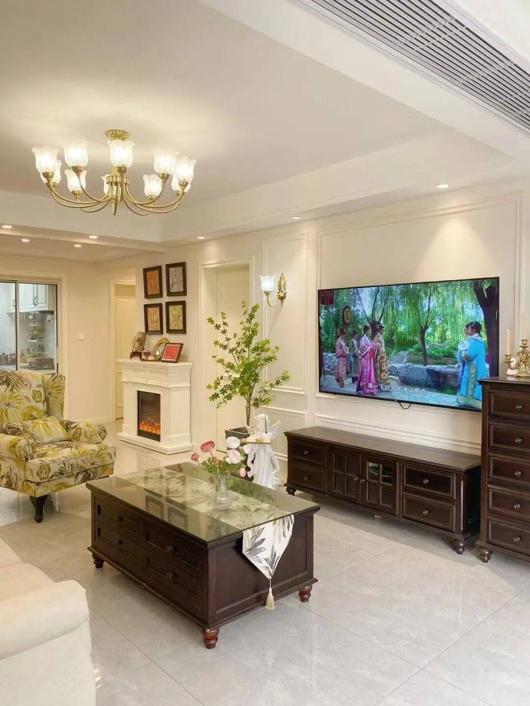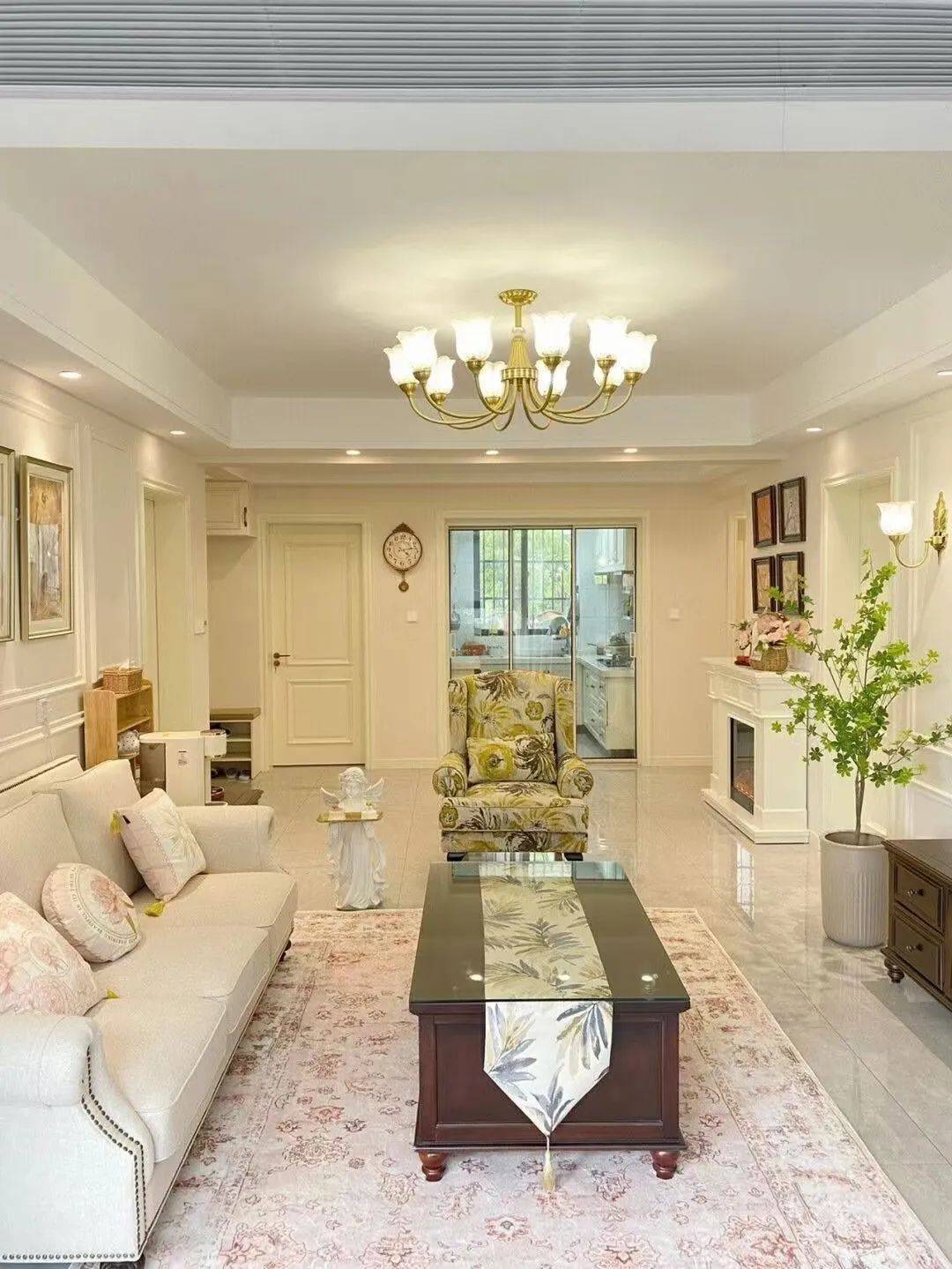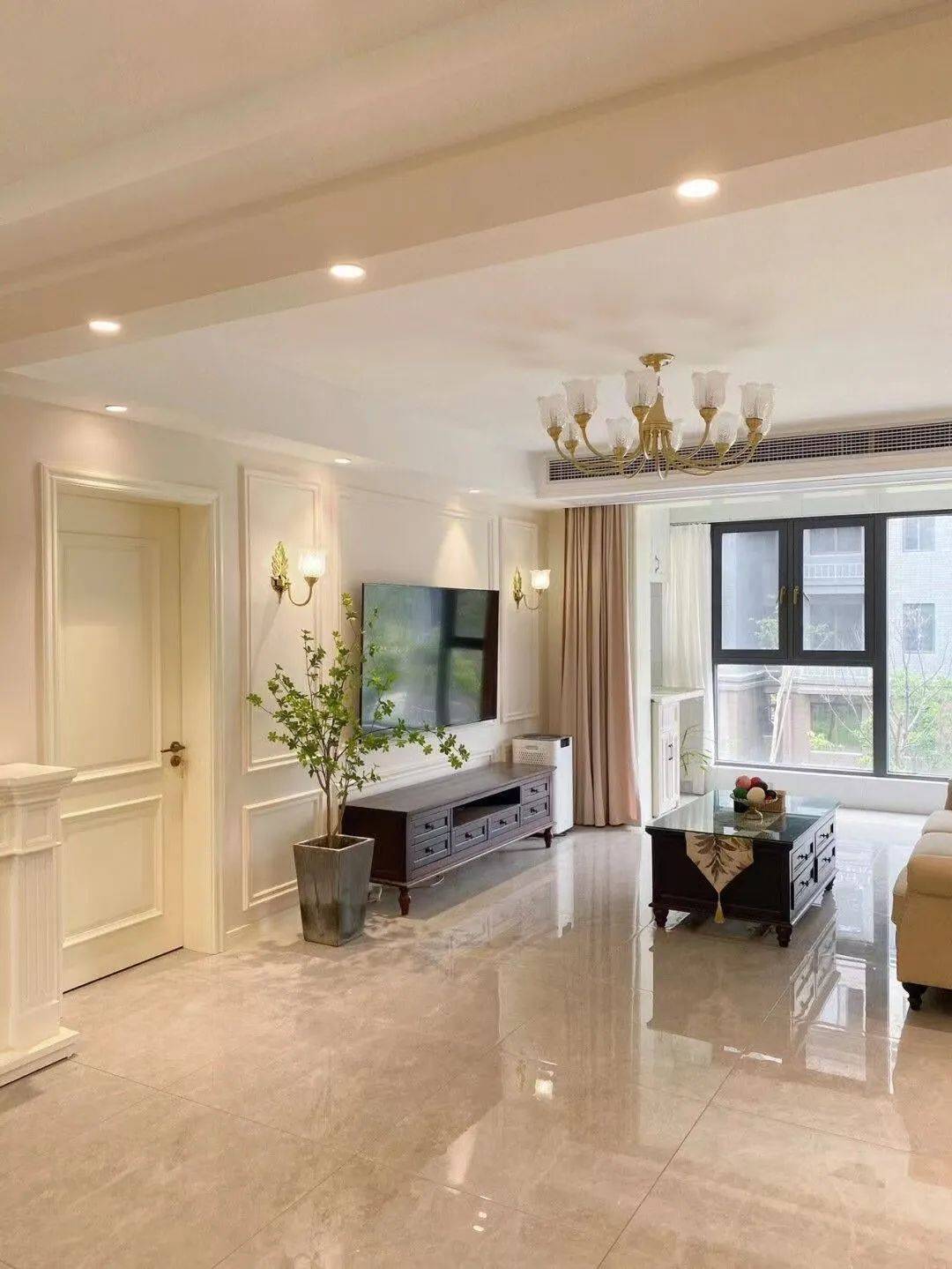 天花板线条简洁明快,嵌入式的射灯分布均匀,使空间更加明亮通透,既凸显现代感又与吊灯的传统风格相辅相成。