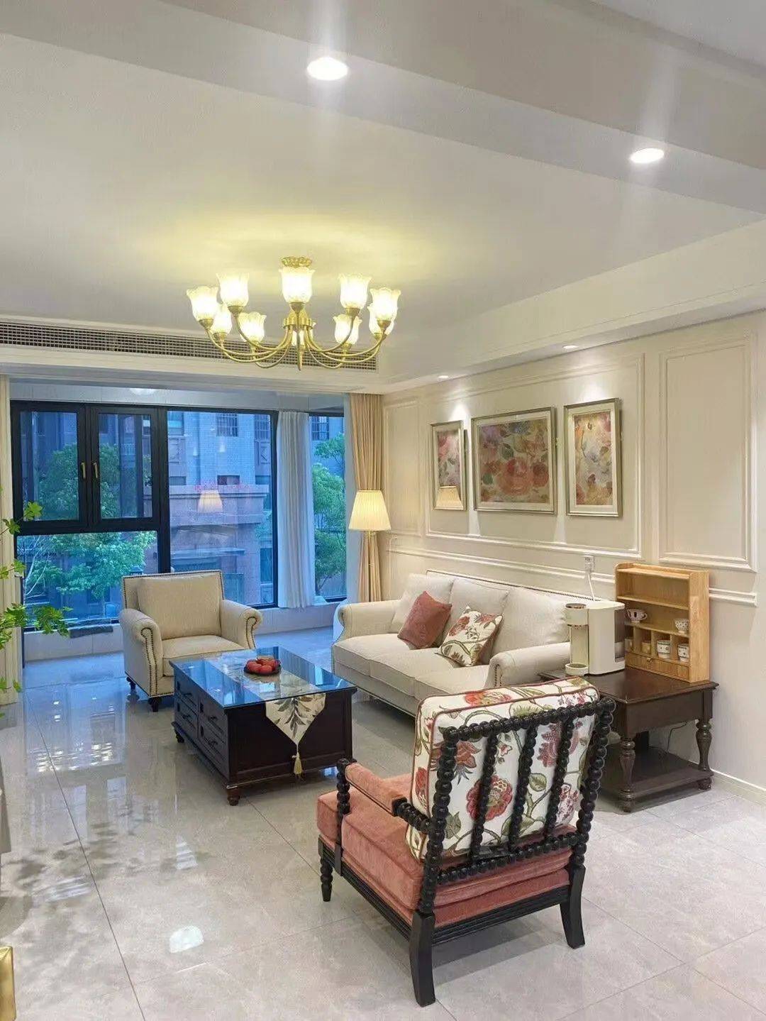 中央悬挂着一盏复古风格的枝形吊灯,金色灯架散发出典雅的光泽,灯罩呈花朵造型,散发出柔和的暖光。