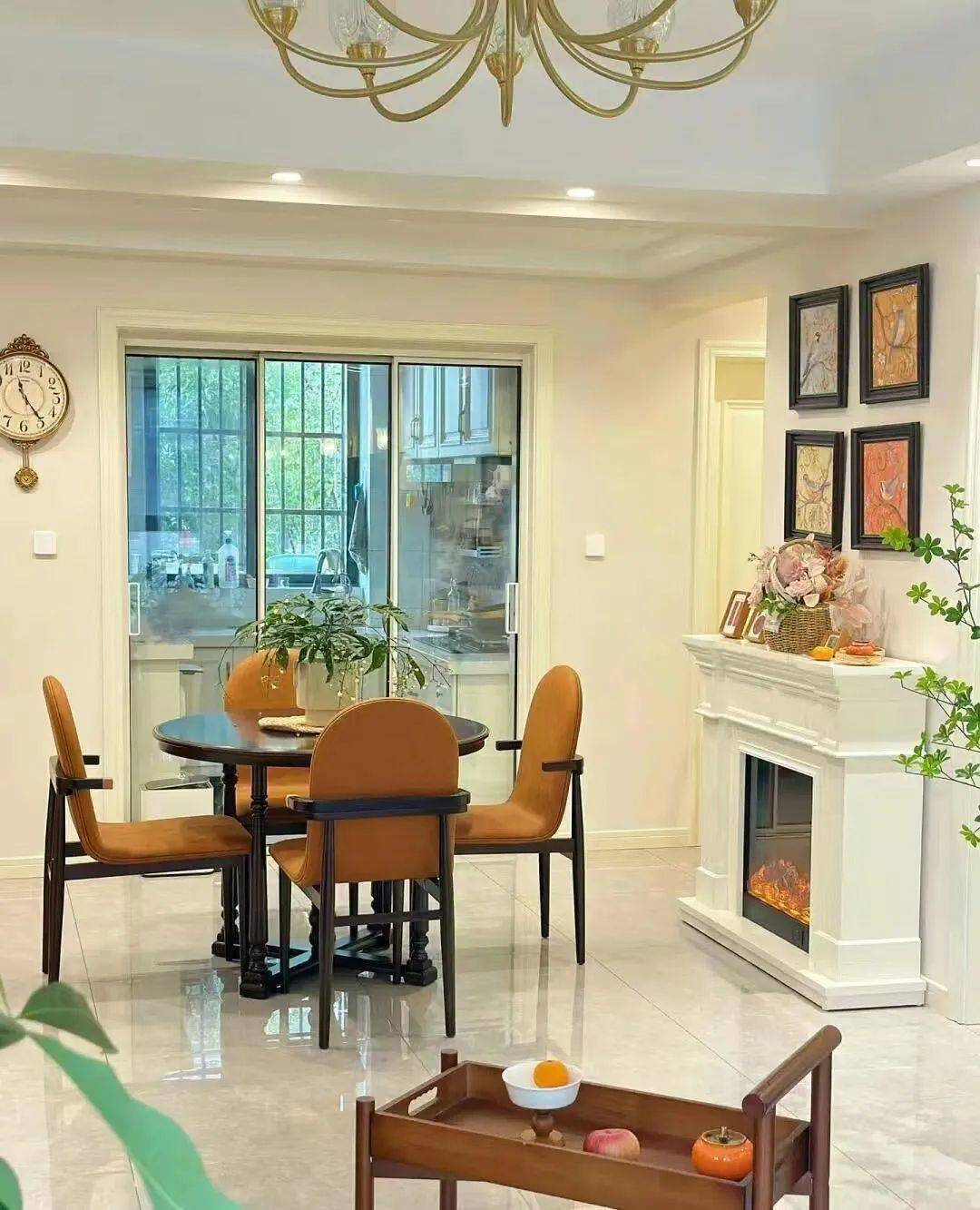 餐椅的设计简约流畅,椅背和座垫采用温暖的橙黄色布艺,带有柔和的现代感,椅腿与餐桌腿部的深色木质框架则增加了稳重与对称的美感。