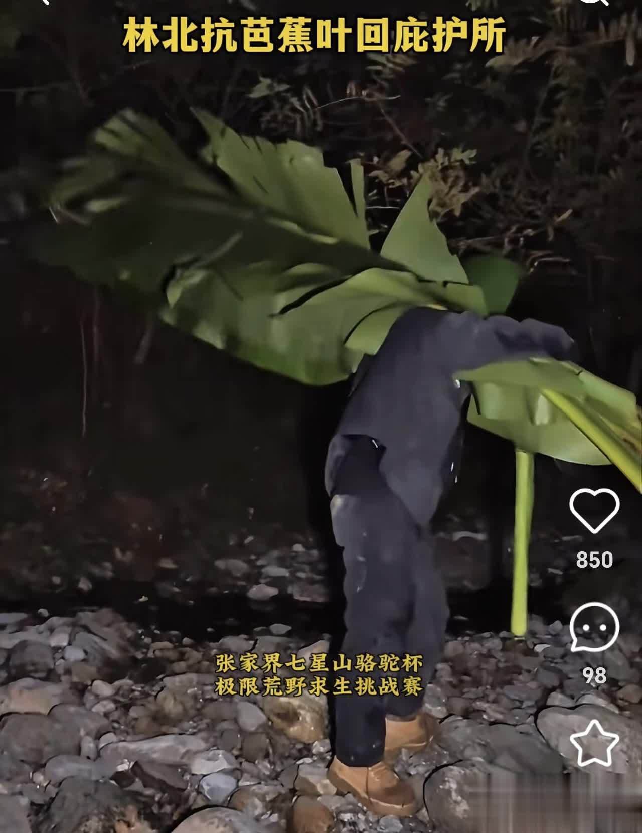 开赛第一天,林北又给网友贡献了不少笑点。别人的衣服都还是干干净净,他又搞得一身泥土。洞还没挖好,他只好扛了几张大大的芭蕉叶回去挡风。